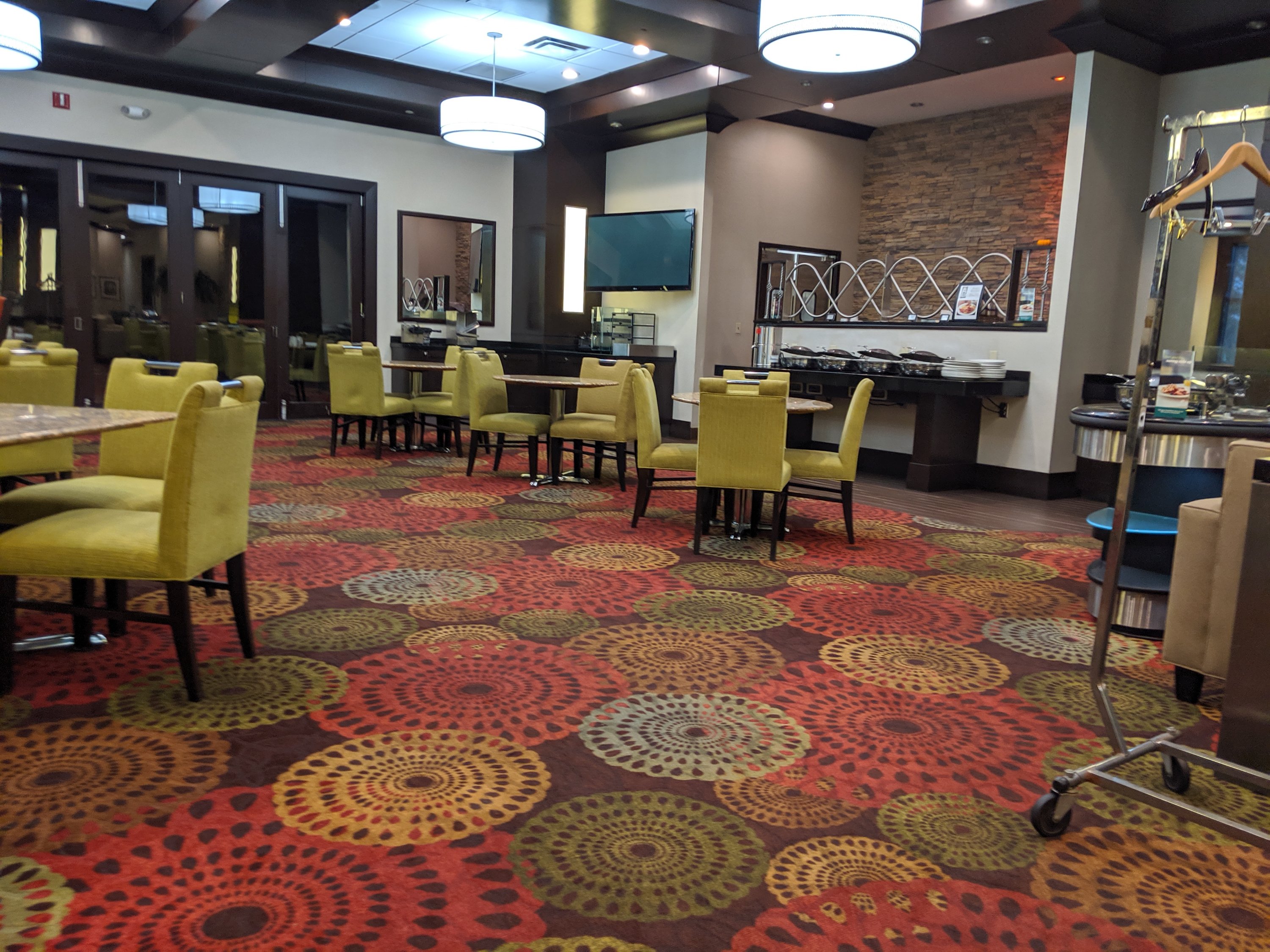 The beds were clean, the pillows good, and the mattresses seemed new and nice. Everything was fresh. It was a pleasant surprise. 5 Stars! I really didn’t love the metal bedframes, and they sat a bit too far from the wall without a headboard to sit against while watching TV or working on my laptop, but a minor complaint. I had a decent night’s sleep and got up early to enjoy several cups of coffee before my early morning meeting was moved later, so I would have a chance to grab the 7am breakfast after all.