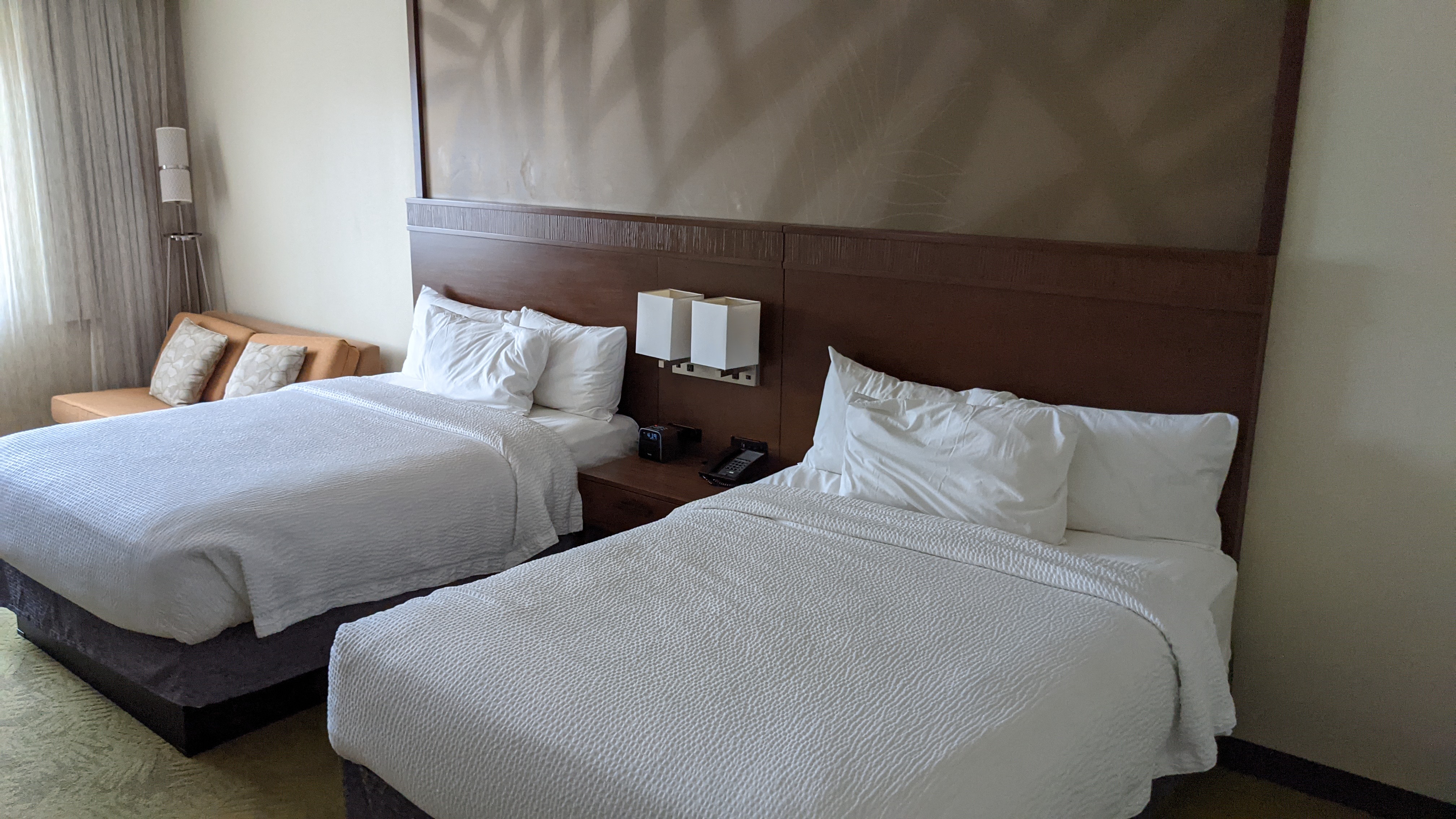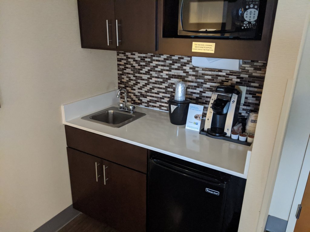 When you enter the room, it has a vanity, refrigerator, and microwave to greet you. Not a fan of having carpet near a vanity, so laminate flooring would be a better choice for this hotel, but the carpet looked new and was spotless.