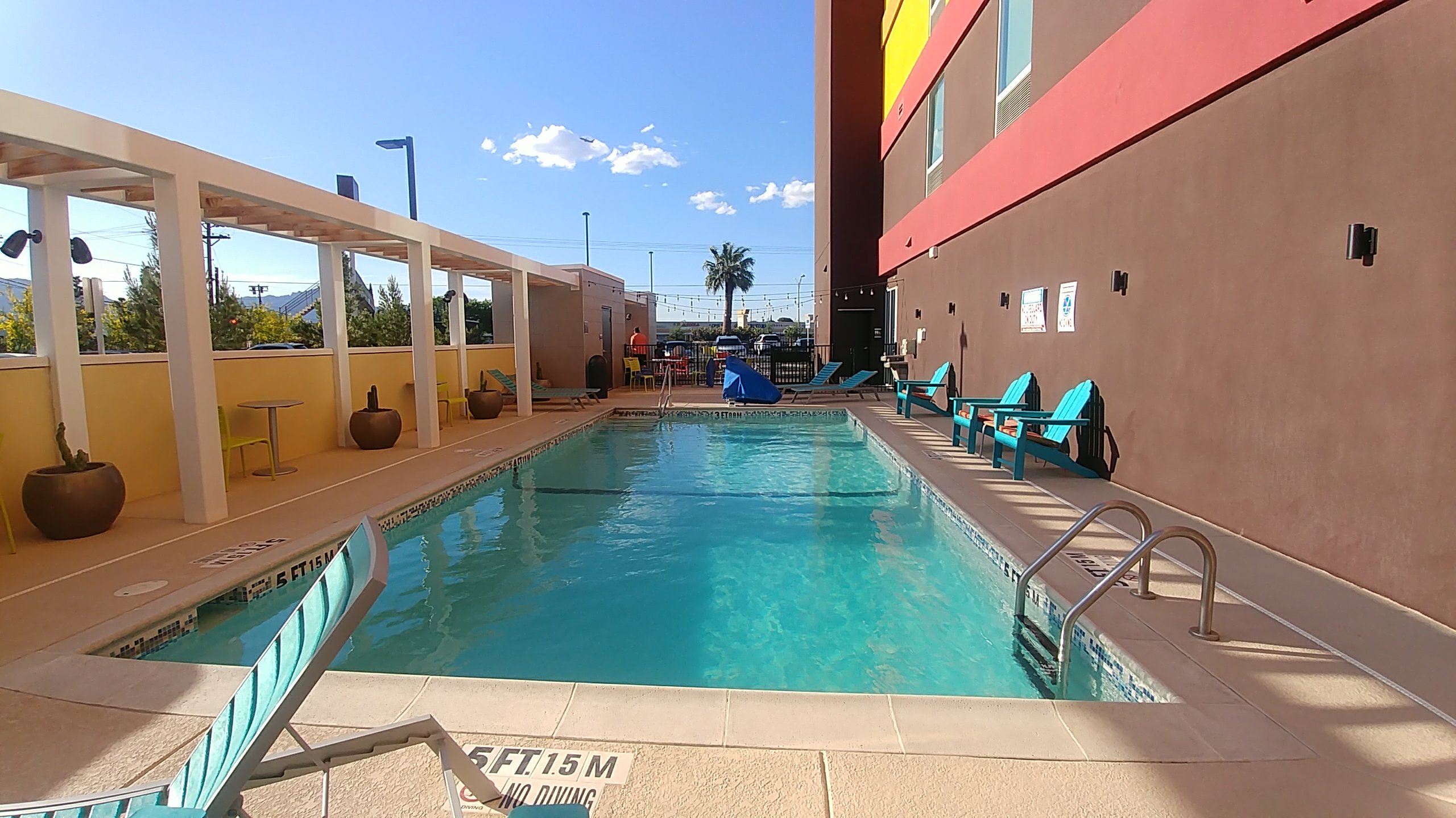 Nice new hotel. Near ELP airport, shopping and many restaurants. Staff is outstanding. Hotel features free breakfast starting at the proper hour of 6am not 6:30am like so many have gone to. Only defect I can see is the fitness seems to have limited hours. All hotels should have 24 hour fitness centers. Working out on the road is hard enough without limited hours. Nice pool and airport shuttle available. Other than the limited fitness hours and shower soap dispensers it is a great hotel by Hilton.
