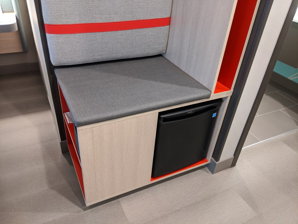 When you enter the room, it has a vanity, refrigerator, and microwave to greet you. Not a fan of having carpet near a vanity, so laminate flooring would be a better choice for this hotel, but the carpet looked new and was spotless.