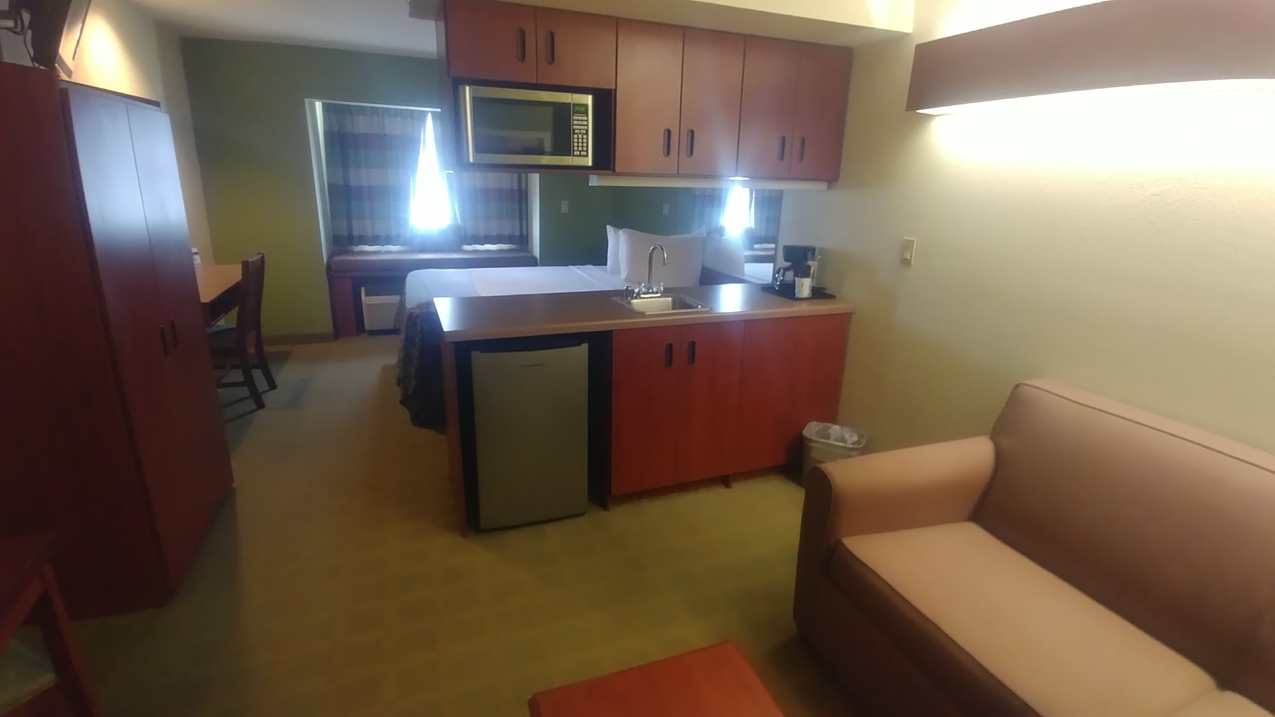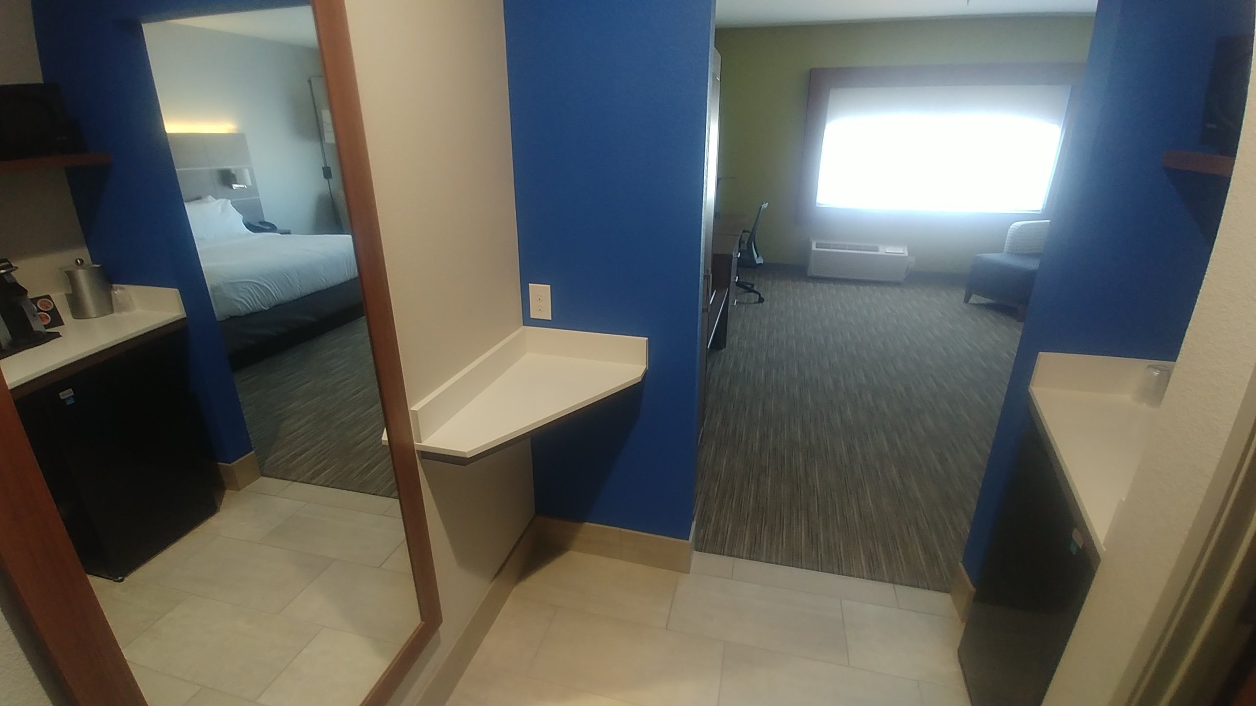 When you enter the room, it has a vanity, refrigerator, and microwave to greet you. Not a fan of having carpet near a vanity, so laminate flooring would be a better choice for this hotel, but the carpet looked new and was spotless.